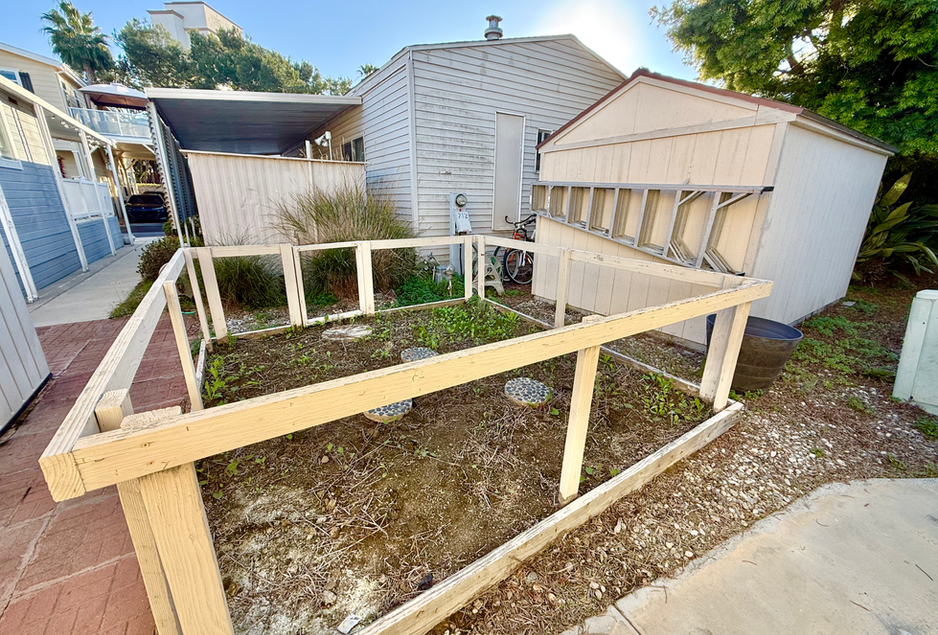 Large lot space includes spacious back patio with barbecue, garden area, carport parking, outdoor sheds, and close to community beach access gate.